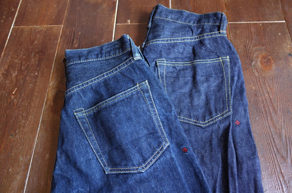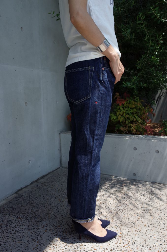 デニム好きが気にする箇所(ムラ糸、赤耳、縫い代、縫い糸)を全て盛り込んで、アタリや色落ちの変化を計算した上でつくr、細い小柄な女性からゴツい大柄な男性までフィットさせてしまう絶妙のパターン、